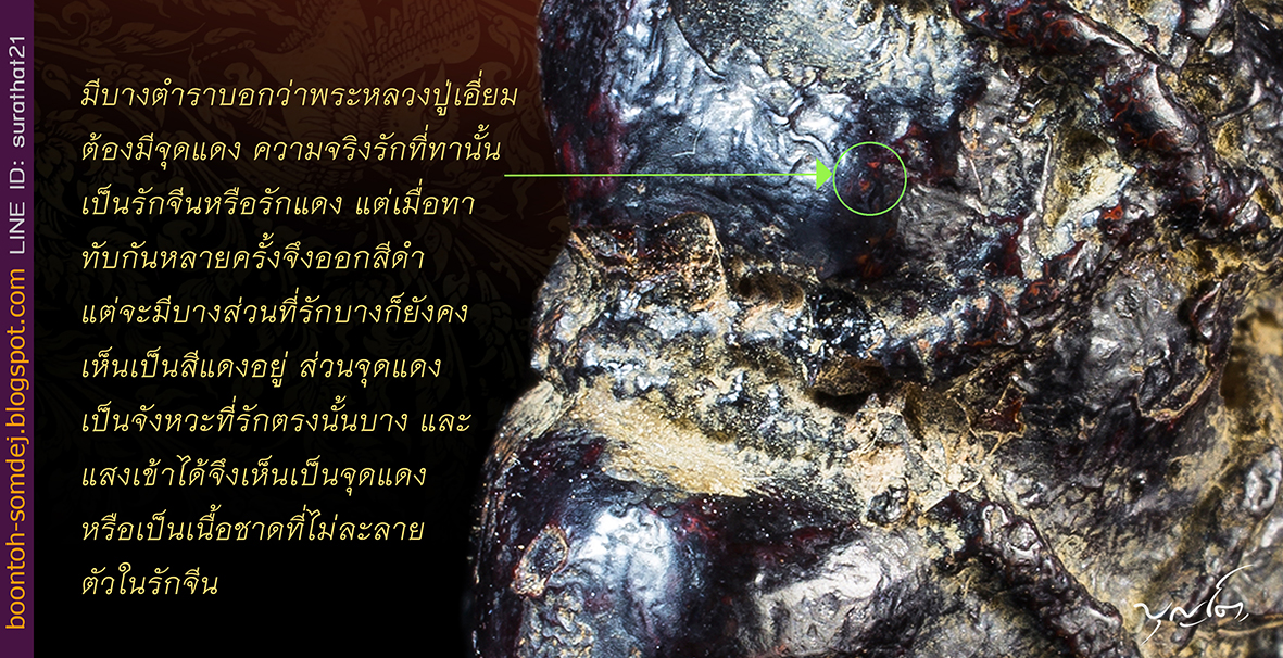 | พระปิดตามหามงคลพิมพ์ตะพาบ ของหลวงปู่เอี่ยมวัดสะพานสูงองค์นี้มี สายสิญจน์พันมัดรอบองค์พระไม่แน่ใจว่าเขามีศัพย์เรียกพระลักษณะนี้หรือไม่ พระองค์นี้มีความสมบูรณ์มากเมื่อเจ้าของเดิมนำมาให้ดูคิดว่ารักใหม่ แต่พอส่องด้วยกล้องขยายถึงรู้ว่าเก่าจริงๆ เพราะรักมีความมันจริงแต่มีความแห้งในตัวและเหี่ยว บางส่วนก็หลุดกะเทาะออกไปบ้างรักก็เป็นรักจีน จึงขอเช่าบูชาเก็บไว้ เป็นพระที่สวยและสมบูรณ์มาก จะพูดถึงการลงรักของพระปิดตาหรือตะกรุดหลวงปู่เอี่ยมวัดสะพานสูง จากที่ศึกษาและสังเกตมาพระของท่านและพระในยุคท่านหรือก่อนท่านจะใช้รักจีน แม้แต่พระบูชาพระรัตนะที่สร้างในสมัยรัชกาลที่ 3 ก็ใช้รักจีน ช่วงหลวงปู่เอี่ยมสร้างพระน่าจะเป็นช่วงปลายของการใช้รักจีนแล้ว ในสมัยร.4ท่านให้หยุดสั่งสินค้าจีนบางอย่างรวมทั้งรักจีนด้วย รักที่ตกค้างอยู่ก็คงใช้หมดไปต้น ร.5 (เป็นความเห็นส่วนตัว ร.5 ขึ้นครองราช พ.ศ.2411 ปีนั้นหลวงปู่เอี่ยมอายุ 53ปี ) เพราะหลังหลวงปู่เอี่ยมก็เห็นมีแต่รักดำหรือรักสมุกที่ใช้กัน รักที่สั่งมาจากประเทศจีนเรียกกันว่ารักไอ้มุ่ยมากจากเมืองเอ้มึ้ง รักจีนเป็นรักผสมผงชาด(ชาดจอแสมาจากเมืองจอแส) จึงออกสีแดง เมื่อทาทับหลายๆครั้งจะออกสีดำ ไม่มีการจุ่มรักเพราะรักจะไม่แห้งหรือแห้งยาก เหมือนน้ำมันตังอิ๊วที่เคยเล่า เขาจะทาทับทีละชั้น ในเนื้อรักจะมีผงชาดที่ไม่ละลายตัวผสมอยู่ ผู้ชำนาญการดูพระปิดตาปู่เอี่ยมแนะว่าให้ดูจุดแดงในพระปู่เอี่ยมเป็นหลัก แต่เขาคงไม่ทราบว่าจุดแดงนั้นมีที่มาที่ไปอย่างไรแต่เป็นสิ่งที่เขาเจอเลยยึดถือเป็นหลักการดูไป สรุปว่าถ้าเราเข้าใจเรื่องของรักจีนรักไทย เข้าใจความเก่าของรัก เราก็จะดูพระยุคเก่าๆได้ไม่ยาก |