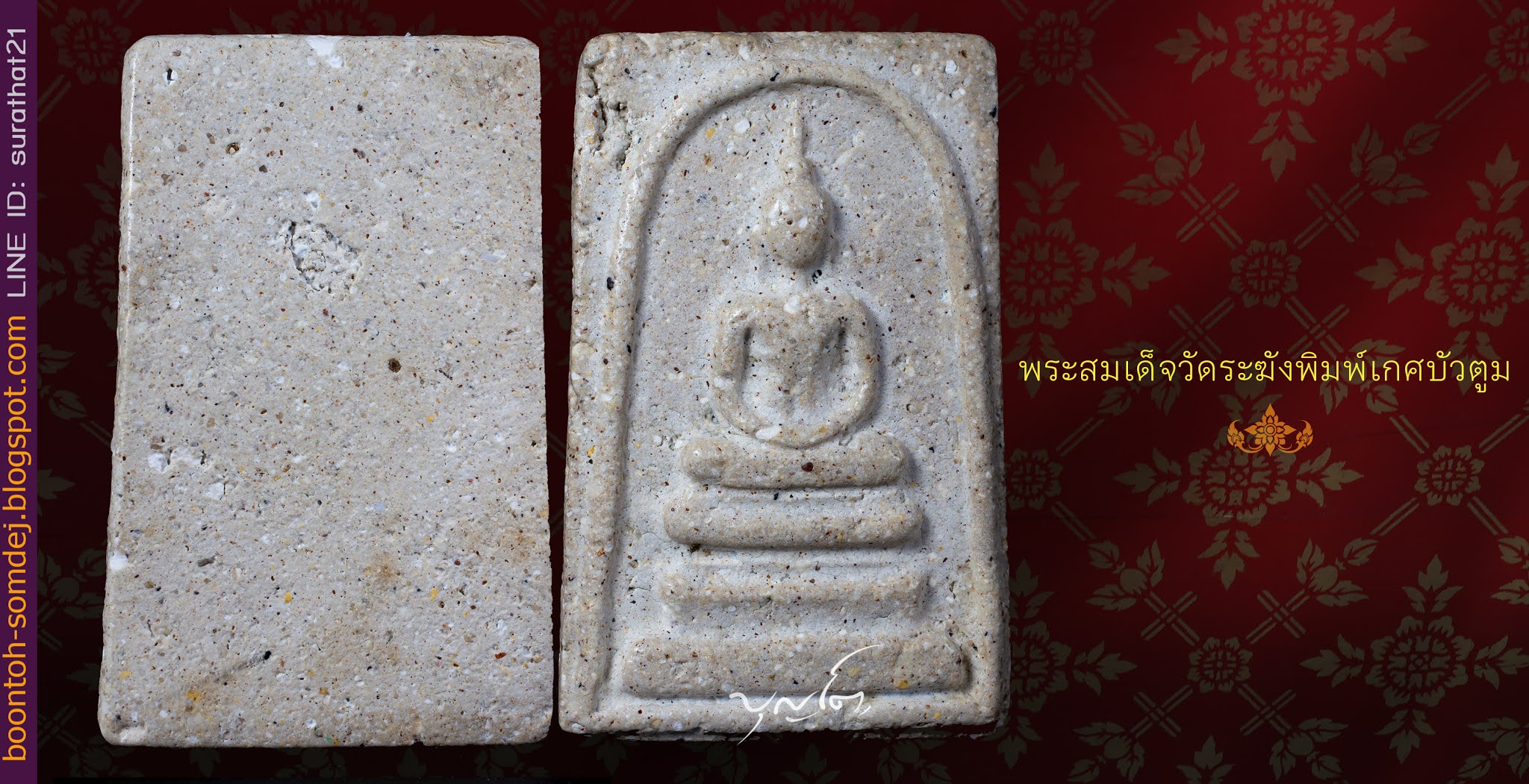 พระสมเด็จวัดระฆังพิมพ์เกศบัวตูม พระองค์นี้เป็นฝีมือช่างหลวง เป็นพระยุคปลาย คือสร้างระหว่างปี พ.ศ.๒๔๐๗-๒๔๑๕ เนื้อหนึกเหนียว พระผ่านการใช้มาพอสมควร ทำให้ผิวพระเปิดจึงได้เห็นมวลสารหลากหลายในเนื้อพระ.